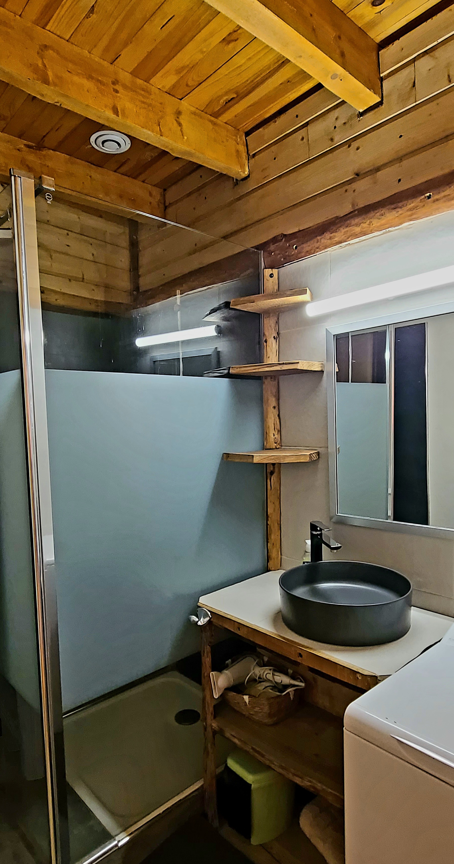 Douche, meuble de rangement, machine à laver